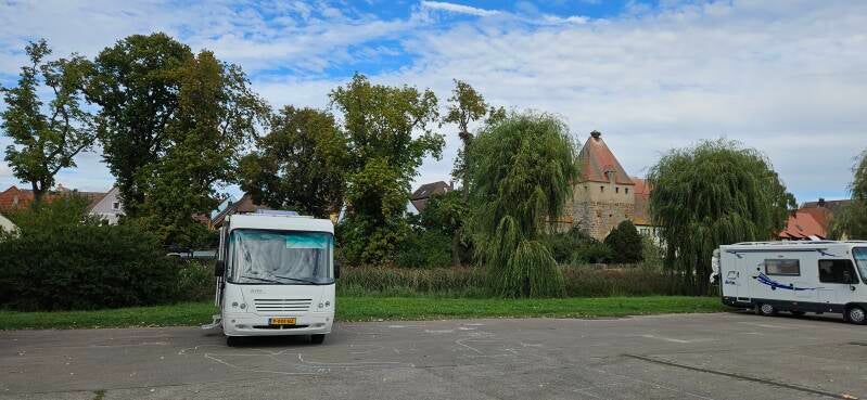 Nu sta ik op een grote camperplaats in Dinkelsbühl. De plek zelf staat helemaal vol, met zeker veertig campers. Gelukkig is er aan het eind een mooi parkje met bankjes en stoelen aan het water. Een heerlijke plek om morgenochtend mijn koffie te drinken, voordat ik rond negen uur weer vertrek. Door al het oponthoud moet ik de komende week nog zo’n 700 km rijden, dus de vaart moet er wel een beetje in blijven.